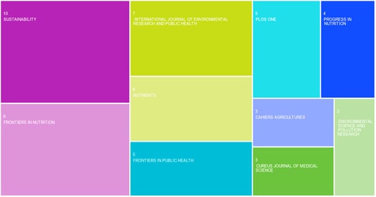 As for publication titles (Figure 1), the highest number of articles were published in Sustainability (10 articles, 6.62%), followed by Frontiers in Nutrition (9 articles, 5.96%), International Journal of Environmental Research and Public Health (7 articles, 4.64%), Nutrients (6 articles, 3.97%), and Frontiers in Public Health and PLOS One (5 articles, 3.31%, each). Nonetheless, the 151 papers describing the conclusions of the research on the effects of the pandemic on agri-food systems in the NENA area were published in 96 sources and journals, indicating no dominant publishing outlet.