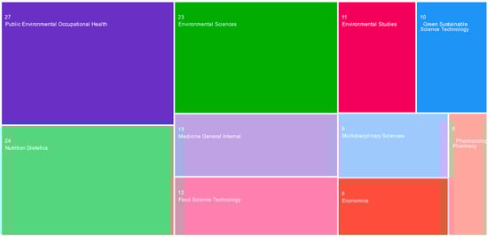 Most of the selected articles are in this research areas of Public environmental Occupational health (27 articles, 17.88%), Environmental sciences—Ecology and Nutrition dietetics (24 articles, 15.89% each), Science technology (19 articles, 12.58%), General internal medicine (14 articles, 9.27%), Business economics (13 articles, 8.60%), Food science technology (12 articles, 7.94%), and Agriculture (10 articles, 6.62%) (Figure 2). Nevertheless, the 151 eligible articles can be categorized under 32 research fields (e.g., pharmacology, psychiatry, psychology, development studies, engineering, geography, computer science, biology, pediatrics, sociology, surgery, tropical medicine, veterinary sciences, and zoology), which demonstrate that this research field is multidisciplinary.