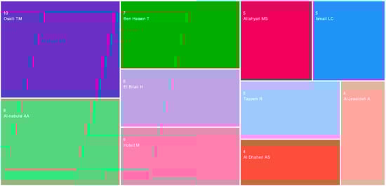 According to the findings, the most notable and active authors in this research area are Tareq M. Osaili (10 articles/6.62%, Jordan University of Science and Technology), Anas A. Al-Nabulsi (9 articles/5.96%, Jordan University of Science and Technology), Tarek Ben Hassen (7 articles/4.64%, Qatar University), Hamid El Bilali (6 articles/3.97%, CIHEAM-Bari, Italy), and Maha Hoteit (6 articles/3.97%, Lebanese University) (Figure 3). Nonetheless, the 151 chosen publications were written by 719 experts, indicating that most interested researchers wrote a single paper. This implies a significant level of cooperation within this study field, which is surprising considering the relatively recent emergence of this particular research area.