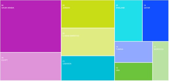 The examination of affiliations reveals that the list of the most active nations is headed by Saudi Arabia (56 articles, 37.09%), Egypt (30 articles, 19.87%), Jordan, and the United Arab Emirates (26 articles, 17.22%, each), and Lebanon (23 articles, 15.23%) (Figure 4). The list of the top-ten affiliation countries includes eight NENA countries (viz., Saudi Arabia, Egypt, Jordan, the United Arab Emirates, Lebanon, Qatar, Tunisia, and Morocco), which might indicate the dynamism and strength of this research system in the region in general and the concerned countries in particular. The 151 chosen articles were written by academics and scientists from 56 different nations, which implies a strong collaboration between NENA researchers and those from abroad (especially from the UK and USA).
