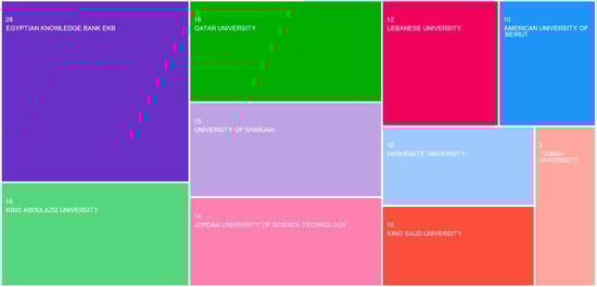 Meanwhile, the analysis of affiliation institutions suggests that the most prominent research centers and universities in the research strand are located in NENA countries, namely the Egyptian Knowledge Bank (Egypt), King Abdulaziz University (Saudi Arabia), Qatar University (Qatar), University of Sharjah (UAE), Jordan University of Science and Technology (Jordan), and the Lebanese University (Lebanon) (Figure 5). This confirms the previous observation regarding the dynamism and vitality of the research systems in the concerned countries. In addition to the institutions already mentioned, other major institutions in the region are located in: Bahrain (University of Bahrain), Egypt (Al Azhar University, Mansoura University), Jordan (Hashemite University, University of Jordan, Al Balqa Applied University), Lebanon (American University of Beirut), Morocco (Moulay Ismail University of Meknes), Oman (Sultan Qaboos University), Palestine (Al Quds University), Saudi Arabia (King Saud University, Taibah University, King Faisal University, Princess Nourah Bint Abdulrahman University), and the UAE (United Arab Emirates University, Zayed University). The 151 publications chosen for this study were written by researchers affiliated with 338 universities and research institutes. This finding suggests a high level of cooperation within the scholarly community.