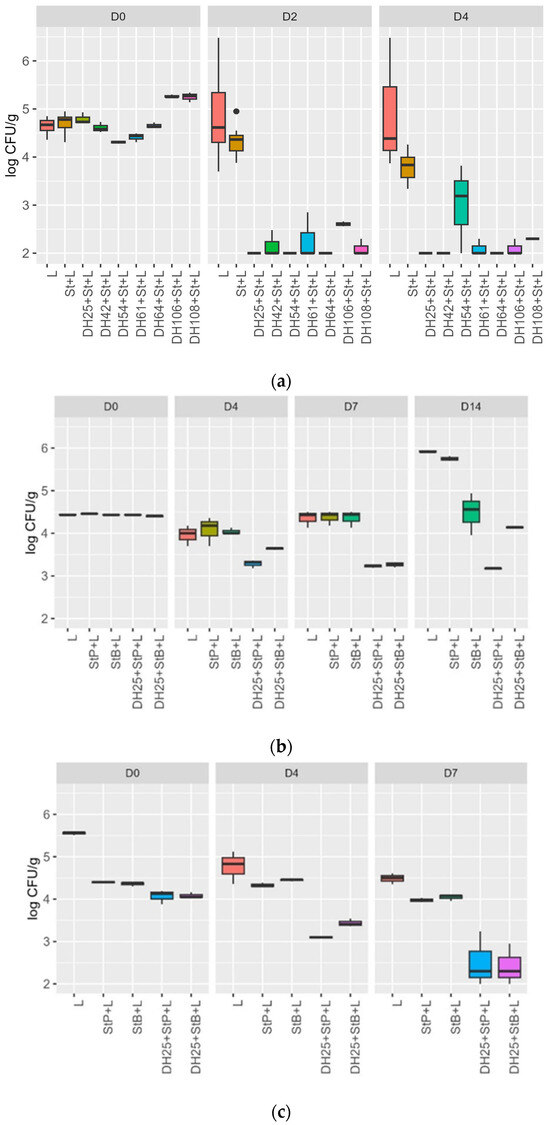 (a): Log CFU/g of Listeria monocytogenes N18-440 during a meat model challenge test, simulating the ripening of a raw sausage on days 0, 2, and 4. Seven samples were inoculated with the following: L = Listeria monocytogenes, St+L = starter culture + Listeria monocytogenes, DH25, DH42, DH54, DH61, DH64, DH106, DH108+St+L= LAB strain + starter culture + Listeria monocytogenes; as the starter culture, BessaStart (Moguntia Food Group, Gossau, Switzerland) was used. (b): Log CFU/g of Listeria monocytogenes N18-440 in a meat model challenge test for 14 days at 8 °C on day 0, day 4, day 7, and day 14. Five samples were inoculated with the following: L = Listeria monocytogenes, StP+L = Starter culture PrestoStart + Listeria monocytogenes, StB+L = Starter culture BessaStart + Listeria monocytogenes, DH25+StB+L = LAB strain + Starter culture BessaStart + Listeria monocytogenes, DH25+StP+L = LAB strain + Starter culture PrestoStart + Listeria monocytogenes. (c): CFU/g of Listeria monocytogenes N18-440 in a meat model challenge test for 7 days at 12 °C on day 0, day 4, and day 7. Five samples were inoculated with the following: L = Listeria monocytogenes, StP+L = Starter culture PrestoStart + Listeria monocytogenes, StB+L = Starter culture BessaStart + Listeria monocytogenes, DH25+StB+L = LAB strain + Starter culture BessaStart + Listeria monocytogenes, DH25+StP+L = LAB strain + Starter culture PrestoStart + Listeria monocytogenes.