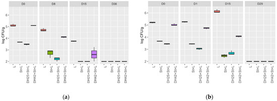 Log CFU/g of Listeria monocytogenes N18-440 in a challenge test during the ripening and storage of a raw sausage for (a) Salami on day 0, day 8, day 15, and day 36 and (b) Mettwurst on day 0, day 1 day 15 and day 29. Four samples were inoculated with the following: L = Listeria monocytogenes, St+L = Starter culture + Listeria monocytogenes, DH25+St+L and DH42+St+L = LAB strain + Starter culture + Listeria monocytogenes; as the starter culture, PrestoStart (Moguntia Food Group, Gossau, Switzerland) was used.