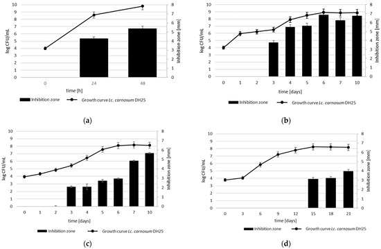 Growth curves of Lc. carnosum DH25 in MSM+ broth at 30 °C (a), 12 °C (b), 8 °C (c), and 4 °C (d) and inhibition zones against L. monocytogenes N18-440 (the radius was measured from the edge of the well to the edge of the inhibition zone in mm of corresponding CFS determined by a WDA; mean values with standard deviation (n = 3).