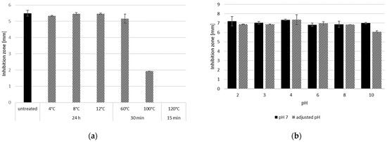 Inhibition zones against L. monocytogenes N18-440 (the radius was measured from the edge of the well to the edge of the zone of inhibition in mm) of heat-treated CFS (24 h at 4 °C, 8 °C, and 12 °C; 30 min at 60 °C and 100 °C; 15 min at 120 °C) compared to non-treated CFS in a WDA; mean values with standard deviation (n = 3) (a). Inhibition zones (radius measured from edge of the well to the edge of the zone of inhibition in mm) of CFS with pH adjusted to 2, 3, 4, 6, 8, and 10 and incubated for two hours at room temperature before being re-adjusted to pH 7, compared to CFS at pH 7 in a WDA; mean values with standard deviation (n = 2) (b).
