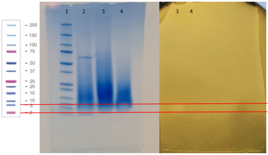 The CFS of Lc. carnosum DH25 (26 h, 30 °C) was concentrated via protein size exclusion. First, it was filtered via ultra-filtration (PALL Corporation, Basel, Switzerland, MinimateTM EVO TFF System, OAPMPUNV) using a 10kDA membrane filter (PALL Corporation, MinimateTM TFF Capsules, PN OA010C12). The filtrate was concentrated (1:10) using a 1kDA membrane filter (PALL Corporation, MinimateTM TFF Capsules PN, OA001C12). Further analyses proceeded with the retentate (with a protein size between 1 kDa and 10 kDa). Sodium Dodecyl Sulphate-PolyAcrylamide Gel Electrophoresis (SDS-PAGE) was utilized using a gradient Mini-PROTEAN TGX Gel with 4–20% acrylamide (BIO RAD, Marnes-la-Coquette, France) and the Dual Xtra Prestained Protein Standard (BIO RAD, Marnes-la-Coquette, France). The bacteriocin activity gel assay was utilized as described by Miescher et al. (2000) [18] with some modifications. Samples were loaded identically on two halves of a gel, which was then cut into two parts after the electrophoresis. As a positive control, 0.1% of bovine serum albumin (BSA) (A7906, Sigma-Aldrich®, Burlington, MA, USA) was loaded on SDS-PAGE. The protein bands on one half were stained with the PageBlueTM Protein Staining Solution (Thermo Fisher Scientific Inc., Basel, Switzerland). For renaturation, the other half of the gel was soaked in 2.5% of Triton X-100 for 1 h at room temperature with gentle agitation and then washed in distilled water for 4 h. This gel was placed on a BHI agar plate and overlaid with BHI soft agar (0.8% w/v), inoculated with 4 log CFU/mL L. monocytogenes SLCC 27555 and incubated for 24 h at 37 °C.