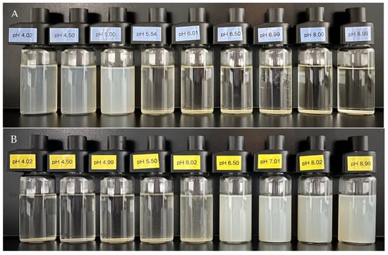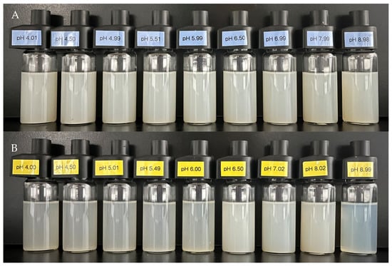 Appearance of zein/OSA-modified starch nanoparticles prepared at pH 4.0 (A) and pH 9.0 (B) as a function of pH.