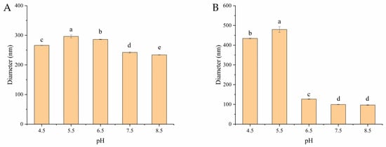 Particle size of zein/OSA-modified starch nanoparticles prepared at pH 4.0 (A) and pH 9.0 (B) as a function of pH. Different letters above the bars indicate significant differences (p < 0.05).