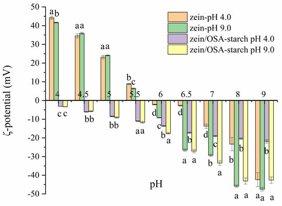 Zeta-potential of zein nanoparticles and zein/OSA-modified starch nanoparticles prepared at different pH levels as a function of the pH. Different letters above the bars at the same pH indicate significant differences (p < 0.05).