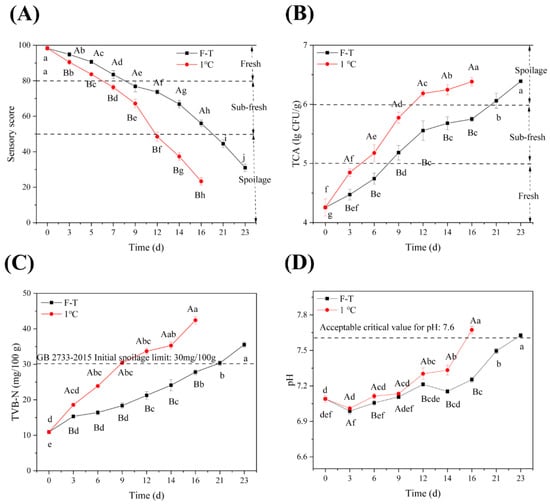 Physicochemical properties of Penaeus vannamei under different storage conditions. (A) Sensory evaluation; (B) TPC; (C) TVB-N; (D) pH. (The F-T cycle is set as a cycle of −20 °C storage for 12 h followed by 1 °C storage for 12 h). Different capital letters indicate significant differences between different storage methods for the same storage time. Different lowercase letters indicate significant differences between different storage times for the same storage method (p < 0.05).