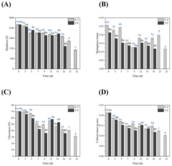 Textural characteristics of shrimp meat under different storage conditions. (The F-T cycle is set as a cycle of −20 °C storage for 12 h followed by 1 °C storage for 12 h). Different capital letters indicate significant differences between different storage methods for the same storage time. Different lowercase letters indicate significant differences between different storage times for the same storage method (p < 0.05). (A) Hardness; (B) Springiness; (C) Chewiness; (D) Cohesiveness.