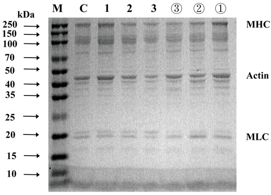 SDS-PAGE profiles of myofibrillar proteins from shrimp with different freshness levels (M: marker, C: control group, 1, 2 and 3: fresh, sub-fresh, and spoilage of F-T group, ①, ②, ③: fresh, sub-fresh, and spoilage of cold-storage group, MHC: myosin heavy chain, MLC: myosin light chain). (The F-T cycle is set as a cycle of −20 °C storage for 12 h followed by 1 °C storage for 12 h).