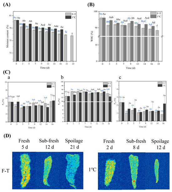 Moisture changes in shrimp meat: (A) Moisture content, (B) WHC; (C) Proportion of peak area in T2 relaxation time of shrimp: (a: T21, b: T22, c: T23); and (D) 1H-MRI pseudocolor maps. (The F-T cycle is set as a cycle of −20 °C storage for 12 h followed by 1 °C storage for 12 h). Different capital letters indicate significant differences between different storage methods for the same storage time. Different lowercase letters indicate significant differences between different storage times for the same storage method (p < 0.05).