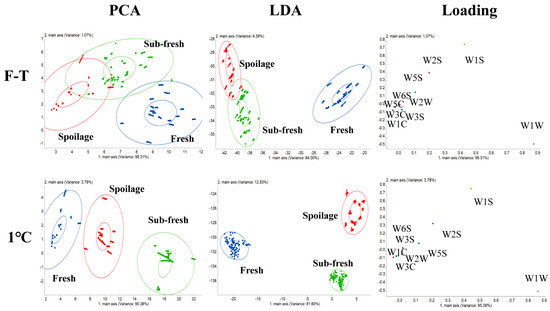 Plot of PCA, LDA, and loading analyses for different sensory freshness levels of shrimp. (The F-T cycle is set as a cycle of −20 °C storage for 12 h followed by 1 °C storage for 12 h).