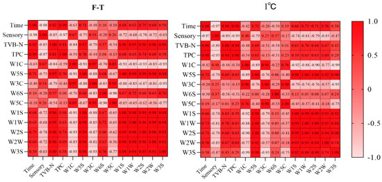 Correlation analysis of shrimp sensory evaluation, TPC, and TVB-N with sensor response values. (The F-T cycle is set as a cycle of −20 °C storage for 12 h followed by 1 °C storage for 12 h). Note: Darker color indicates a stronger positive correlation; lighter color indicates a stronger negative correlation.