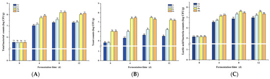 The pH and total acid content are typical indicators of fermented meat products, mainly reflecting the organic acid content of the system and fermentation process [31,32]. The different treatments and fermentation times had significant effects on the pH and total acid content (p < 0.05). A significant decrease in pH was observed in all dry sausages (Figure 2A; p < 0.05), from approximately 6.09 (0 days) to 5.07–5.59 (8 days), due to the rapid multiplication of LAB, as described in our previous study [13]. During this time, these LAB metabolized the added carbohydrates in the sausage preparation to produce lactic acid [33]. Meanwhile, the trend of total acid content showed a rapid increase (Figure 2B). Subsequently, in the later stages of fermentation (8–12 days), there was no fluctuation in pH and total acid content in dry sausages (p > 0.05), which could be associated with the buffering effect on organic acids by amino groups produced by protein degradation [34]. In terms of interaction between the treatments and fermentation times, statistically significant differences were observed in the pH and total acid content (p < 0.05).