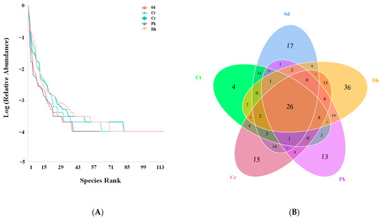 Rank abundance plot (A) and Venn diagram (B) of the control and reduced-salt Harbin dry sausages non-inoculated and inoculated with different yeast strains on days 0 and 12 based on the OTUs of bacteria. 0 d: the sausages on day 0; Ct: 2.50% NaCl; Cr: 1.75% NaCl; Pk: 1.75% NaCl + P. kudriavzevii MDJ1; Dh: 1.75% NaCl + D. hansenii HBR3.