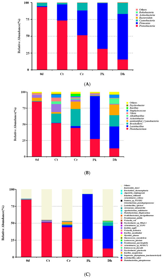 Relative abundance of bacterial compositions at the phylum level (A), genus level (B), and species level (C) of the control and reduced-salt Harbin dry sausages, non-inoculated and inoculated with different yeast strains on days 0 and 12. 0 d: the sausages on day 0; Ct: 2.50% NaCl; Cr: 1.75% NaCl; Pk: 1.75% NaCl + P. kudriavzevii MDJ1; Dh: 1.75% NaCl + D. hansenii HBR3.