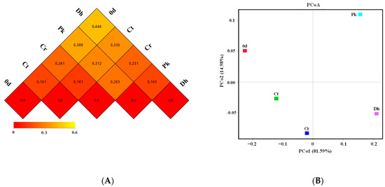Beta diversity index heatmap (A) and principal coordinate analysis (B) of the control and reduced-salt Harbin dry sausages, non-inoculated and inoculated with different yeast strains on days 0 and 12. 0 d: the sausages on day 0; Ct: 2.50% NaCl; Cr: 1.75% NaCl; Pk: 1.75% NaCl + P. kudriavzevii MDJ1; Dh: 1.75% NaCl + D. hansenii HBR3.