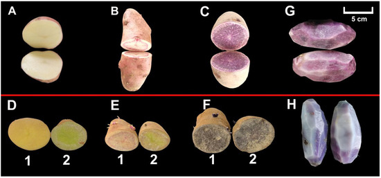Potato nutrients include carbohydrates, proteins, vitamin C, vitamin B, magnesium, potassium, fiber, and so on [1]. In addition, potato tubers contain some phytochemicals, including anthocyanins, carotenoids, and steroidal glycoalkaloids (SGAs) [2,3,4]. These compounds are beneficial to plants’ resistance to environmental biotic and abiotic stresses [5]. Phenolic compounds protect plants from UV damage by acting as a UV shield [6]. Additionally, potato tubers have many health benefits, including antioxidant and anti-tumor properties, the ability to alleviate diabetes and cardiovascular disease, etc. [7,8]. Therefore, potato and its products have received increasing interest from consumers and researchers.