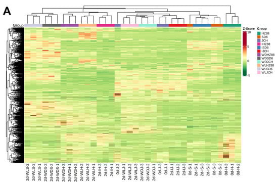 The list of downregulated and upregulated metabolites for each subgroup is provided in Table S3. The majority of the differential metabolites belonged to the categories of alkaloids, flavonoids, and phenolic acids, with significantly higher concentrations in colored potatoes (0dSD6 and 0dJCH) compared to CK potatoes (0dZH88). The contents of these compounds in the 2dWDJCH and 2dWLJCH treatments were also significantly elevated compared to those of the CK (2dIJCH). The quinones and steroids showed a small change not only in different cultivars, but also in each treatment.