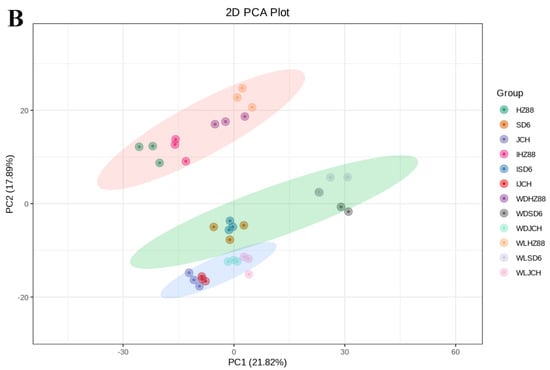 Multiple variable statistical analyses were executed to evaluate the variances in the metabolic profiles of various potato tuber treatments. The potato tuber samples were effectively separated in the heatmap (Figure 2A). In the PCA plot, the first two main components (PC1 and PC2) were observed to account for 21.47% and 17.59% of the data’s variance, respectively. The quality control (QC) samples, comprising a blend of potato tuber extracts, were mapped to the same region, suggesting that they possessed similar metabolic profiles and that the sample data were consistent and reproducible. The 39 samples from the four treatments in three potato tubers were categorized into three separate clusters, indicating that each cluster had a slightly different metabolic profile (Figure 2B). Group 1 included the HZ88 accessions with wounding and light exposure treatments (0dHZ88, 2dIHZ88, 2dWDHZ88, and 2dWLHZ88; Figure 2B). Group 2 included the 0dSD6 accessions with wounding and light exposure treatments (0dSD6, 2dISD6, 2dWDSD6, and 2dWLSD6; Figure 2B). Group 3 included the JCH accessions with wounding and light exposure treatments (0dJCH, 2dIHCH, 2dWDJCH, and 2dWLJCH; Figure 2B). It was feasible to distinguish these three clusters from one another quite plainly. In addition, 0dHZ88 and 2dIHZ88 clustered together, and 2dWDHZ88 and 2dWLHZ88 clustered together in the HZ88 tubers. The results of SD6 and JCH were similar to those of HZ88, which indicated that their metabolic profiles were affected by wounding. The PCA findings demonstrated that there were distinctions in the metabolic profiles among different potato cultivars and treatments, with the impact of wounding seemingly surpassing that of light exposure in terms of the metabolic profile alterations (Figure 2B).