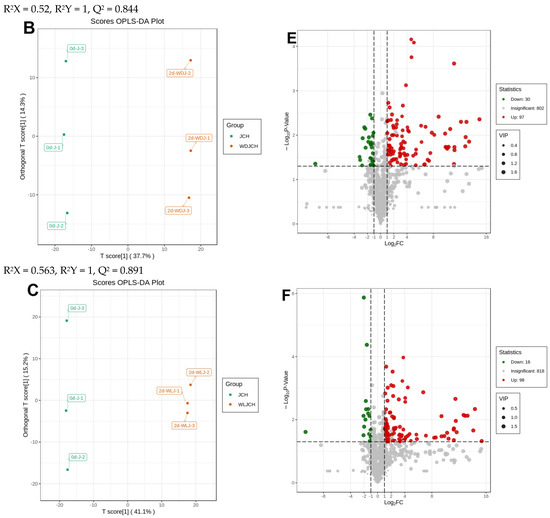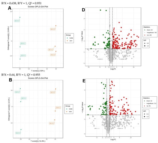 In the current study, the variables that contributed to disparities among the seven groups were screened using OPLS-DA. Here, we assessed the disparities between 0dHZ88 and 0dSD6 (R2X = 0.64, R2Y = 1, Q2 = 0.955), between 0dHZ88 and 0dJCH (R2X = 0.638, R2Y = 1, Q2 = 0.951), between 0dJCH and 0dSD6 (R2X = 0.595, R2Y = 1, Q2 = 0.876), between 0dJCH and 2dIJCH (R2X = 0.524, R2Y = 1, Q2 = 0.72), between 0dJCH and 2dWDJCH (R2X = 0.52, R2Y = 1, Q2 = 0.844), between 0dJCH and 2dWLJCH (R2X = 0.563, R2Y = 1, Q2 = 0.891), and between 2dWDJCH and 2dWLJCH (R2X = 0.463, R2Y = 0.999, Q2 = 0.55) via the OPLS-DA mode.