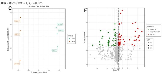 Analysis of metabolomics differences among the three potato flesh types at zero days (0 d). OPLS-DA model graphs (A–C) and loading plots (D–F) for HZ88 in comparison to SD and JCH are presented. Volcano plots display the variations in metabolomics expression levels between HZ66, SD6, and JCH. The downregulated differentially expressed metabolites and upregulated differentially expressed metabolites are denoted by green and red spots, respectively; gray spots signify detected metabolites with insignificant differences. Absolute log2 (fold change, FC) ≥1, −Log10(p-value) ≥1.3.