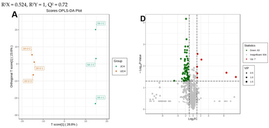 Principal component analysis (PCA), hierarchical cluster analysis (HCA), and orthogonal projections to latent structures discriminant analysis (OPLS-DA) were executed using the R programming language’s prcomp function (www.r-project.org (accessed on 31 October 2023)), with the exception that the PCA and HCA were conducted in an unsupervised manner. The dataset was preprocessed with unit variance scaling prior to analysis. The values of variable importance in projection (VIP) for all metabolites were extracted from the OPLS-DA using the first component, and the OPLS-DA score and permutation plots were produced through the R package called MetaboAnalystR (https://www.metaboanalyst.ca/, accessed on 3 December 2023). The data underwent log transformation (log2) and mean centering prior to OPLS-DA. In order to avoid overfitting, a permutation test (200 permutations) was executed. Metabolites with notably distinct abundances between groups were recognized by VIP ≥1 and absolute log2 (fold change, FC) ≥1.