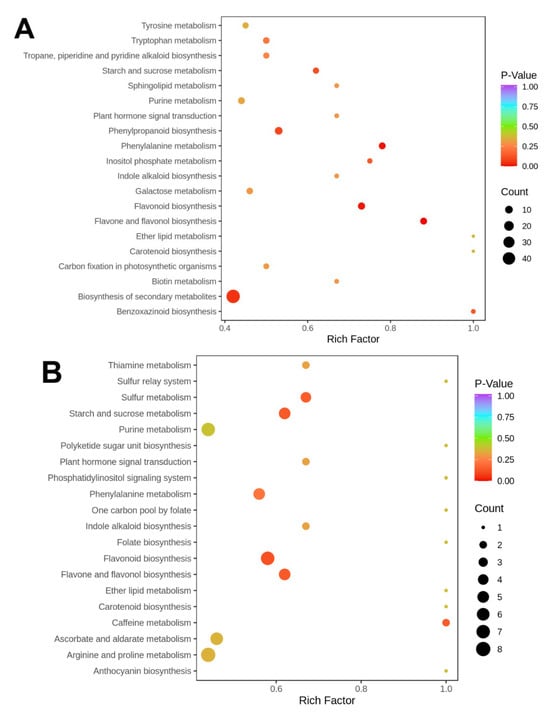 In the current research, a collective total of 427 distinguishable metabolites were detected in the trio of comparison groups; nevertheless, just 88 metabolites were noticed in the variety comparison groups, indicating that the metabolite profiles of the three potato varieties exhibit a notable disparity. The findings of our research align with the outcomes of other investigations. It was discovered by researchers that potato cultivars have an effect on metabolomics [15]. Friedman et al. found that the contents of the total SGA, phenolic compounds, and flavonoids in potatoes demonstrate a considerable range of variation [7]. Interestingly, “flavonoid biosynthesis” existed in the three comparison groups. In these potato cultivars, colored potato tubers are rich in flavonoids, and the related contents of 85 and 79 flavonoids were higher in 0dSD6 and 0dJCH than that in 0dHZ88, respectively. Various metabolites could potentially account for the hue variation in potato flesh. Flavonoids, in the realm of biomedical and health sciences, serve vital physiological functions. They function as free radical eliminators, antioxidants, and singlet oxygen suppressants [21,25]. Therefore, it is very important to cultivate colorful potato tubers to cater to the diverse demands of consumers for health and nutrition.