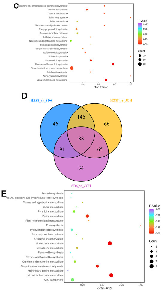 The KEGG database can be used to examine metabolite buildup within a comprehensive network. In the current study, we amplified the varying metabolites of each comparison group and categorized them into diverse pathways. The notably augmented metabolic pathways seen when comparing 0dHZ88 to 0dJCH were associated with “starch and sucrose metabolism”, “phenylpropanoid biosynthesis”, “phenylalanine biosynthesis”, “flavonoid biosynthesis”, “flavone and flavonol biosynthesis”, and “biosynthesis of secondary metabolites” (p < 0.05) (Figure 5A). The notably augmented metabolic pathways seen when comparing 0dHZ88 to 0dSD6 were associated with “sulfur metabolism”, “starch and sucrose metabolism”, “flavonoid biosynthesis”, “flavone and flavonol biosynthesis”, and “caffeine metabolism” (p < 0.05) (Figure 5B). The pathways associated with “ubiquinone and other terpenoid-quinone biosynthesis”, “tyrosine metabolism”, “thiamine metabolism”, “plant hormone signal transduction”, “flavonoid biosynthesis”, “flavone and flavonol biosynthesis”, and “alpha-linolenic acid metabolism” were notably enriched (p < 0.05) in the comparison between 0dSD6 and 0dJCH. (Figure 5C). The data depicted in the Venn diagram demonstrated that a total of 88 metabolites were present in common among the various potato cultivar comparison groups (Figure 5D). The findings implied that the metabolites responsible for the discrepancies exhibited significant variances. To further delve into the distinguishing metabolites of each variety comparison group, the top 10 metabolites with the highest FC values that were upregulated and downregulated in each comparison group were singled out (Figure S2). The upregulated metabolites, in this case, encompassed eight flavonoids and two phenolic acids, while the downregulated metabolites were composed of three alkaloids, one flavonoid, one organic acid, one lignan and coumarin, one terpenoid, and one other metabolite in the comparison of 0dHZ88 vs. 0dJCH (Figure S2A). The upregulated metabolites encompassed eight flavonoids and two phenolic acids, and the downregulated metabolites encompassed three alkaloids, one flavonoid, one lignan and coumarin, one lipid, one organic acid, one phenolic acid, and one terpenoid in the comparison of 0dHZ88 vs. 0dSD6 (Figure S2B). In the comparison of 0dSD6 vs. 0dJCH, the upregulated metabolites encompassed nine flavonoids and one phenolic acid, while the downregulated metabolites were made up of nine flavonoids and one alkaloid (Figure S2C). It is worth noting that the FCs of these compounds were all above 10 in the different cultivar comparison groups.