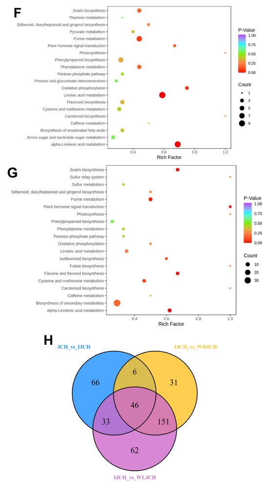 During the light exposure and wounding treatments, the notably amplified metabolic pathways seen when comparing 0dJCH to 2dIJCH were associated with “purine metabolism”, “linoleic acid metabolism”, “biosynthesis of unsaturated fatty acids”, and “alpha-linolenic acid metabolism” (p < 0.05) (Figure 5E). The notably augmented metabolic pathways seen when comparing 0dJCH to 2dWDJCH were associated with “purine metabolism”, “oxidative phosphorylation”, “linoleic acid metabolism”, and “alpha-linolenic acid metabolism” (p < 0.05) (Figure 5F). The notably augmented metabolic pathways seen when comparing 0dJCH to 2dWLJCH were associated with “zeatin biosynthesis”, “purine metabolism”, “plant hormone signal transduction”, “isoflavonoid biosynthesis”, “flavone and flavonol biosynthesis”, and “alpha-linolenic acid metabolism” (p < 0.05) (Figure 5G). The notably augmented metabolic pathways seen in the comparison between 2dWDJCH and 2dWLJCH were associated with “phenylpropanoid biosynthesis”, “isoflavonoid biosynthesis”, “flavone and flvonol biosynthesis”, and “biosynthesis of secondary metabolites” (p < 0.05). The data depicted in the Venn diagram demonstrated that a total of 46 metabolites were common to both the light exposure and wound comparison groups (Figure 5H). These findings indicate that the metabolites responsible for the treatment disparities exhibit significant disparities themselves. The top 10 metabolites with the highest fold change (FC) values in either upregulation or downregulation within each treatment comparison group were singled out (Figure S2). The upregulated metabolites encompassed four alkaloids, three flavonoids, one phenolic acid, one lipid, and one terpenoid. The downregulated metabolites primarily consisted of seven lipids and three flavonoids in the comparison of 0dJCH vs. 2dWDJCH (Figure S2D). In the comparison of 0dJCH vs. 2dWLJCH, the upregulated metabolites were constituted by six flavonoids, two phenolic acids, one organic acid, and one alkaloid, while the downregulated metabolites involved three phenolic acids, two other metabolites, one lipid, one flavonoid, one amino acid and derivative, and one terpenoid (Figure S2E). In the comparison of 2dWDJCH vs. 2dWLJCH, the upregulated metabolites contained five alkaloids, three flavonoids, one phenolic acid, and one lipid, and the downregulated metabolites incorporated six lipids, one alkaloid, one amino acid and derivative, one nucleotide and derivative, and one other metabolite (Figure S2F).