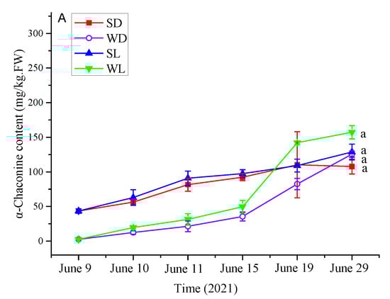 In the current study, a total of 179 different alkaloids were identified in the groups; there were 5, 68, 66, and 19 upregulated metabolites in the 0dJCH vs. 2dIJCH, 0dJCH vs. 2dWDJCH, 0dJCH vs. 2dWLJCH, and 2dWDCH vs. 2dWLJCH groups, respectively, and there were 15, 2, 2, and 2 downregulated metabolites in these groups, respectively (Table S3), which suggested that wounding significantly increased the alkaloid contents. The results could be related to the wounded stress in potato tubers [32]. Through a further analysis of the contents of the major compounds in the potato SGA synthetic pathway on the second day after storage, it was found that some metabolic contents, such as that of solanidine, were higher in 2dWDJCH and 2dWLJCH than those in the other treatments. The contents of the other compounds remained in a narrow range in the different treatments, which may be due to the short sampling time (Figure 6). Importantly, the SGA contents within 48 h among the treatments in potato JCH were similar. In our previous work, significant SGA content changes were observed in wounded potato tubers within 48 h [12], which indicated that the accumulation rate of SGA was different in different potatoes after undergoing the same treatment. In the current investigation, the content of SGA in potato skin demonstrated a significant elevation compared to that in the flesh during the initial phase of storage, with a gradual amplification observed throughout the experimental period. However, the SGA contents in the flesh at the wounded site increased sharply from June 15 to 29, 2021, and then remained in a narrow range at the end of storage (Figure 6). Over 80 SGAs have been detected in potato alkaloid [33]. Although the aggregate amounts of α-chaconine and α-solanine constitute approximately 95% of the entire SGA content in potato [34], we further ascertained the absolute quantities of α-chaconine and α-solanine. Importantly, the SGA contents within the 3 mm wound site remained below 7 mg/kg of FW (α-chaconine: 4.09 ± 1.67 mg/kg. FW; α-solanine: 2.46 ± 0.73 mg/kg. FW; total SGA: 6.55 ± 2.21 mg/kg. FW), which is far below the permissible limit of 200 mg/kg of FW.