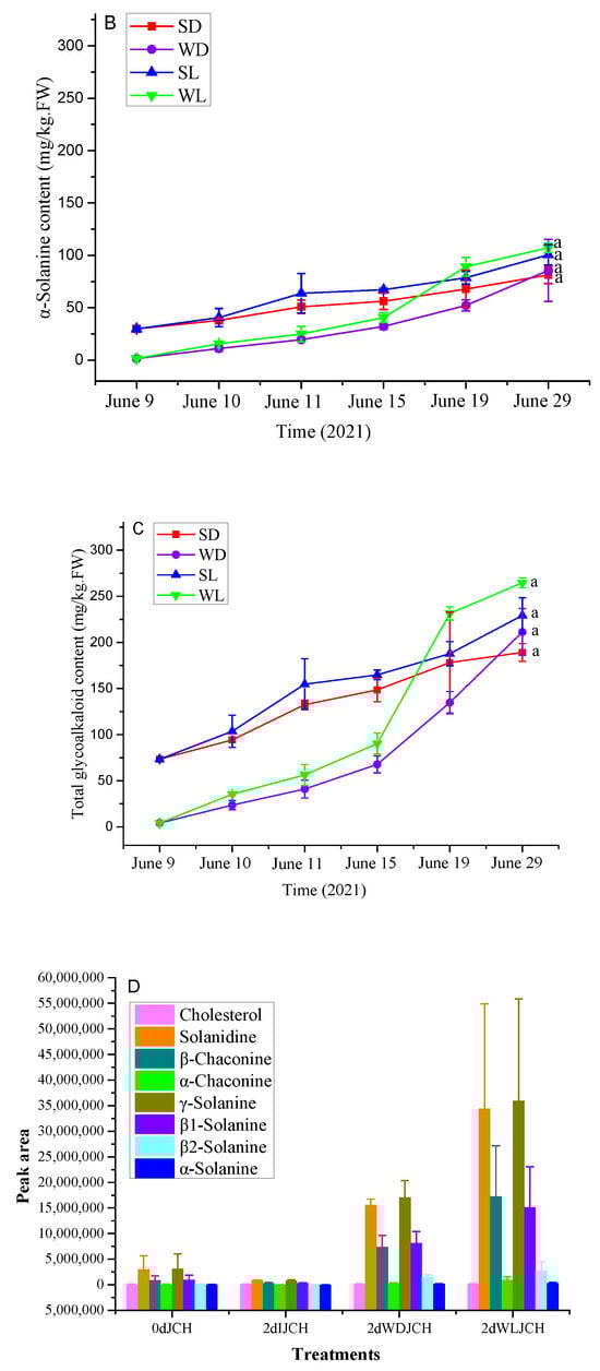 The influence of treatment on SGA metabolite levels in JCH potato tubers. SDJ refers to the wounded tuber skin with dark storage, WD represents the wounded tuber flesh with dark storage, SL represents the wounded tuber skin exposed to light, and WL signifies the flesh of wounded tubers under light exposure. The significant disparities among the groups are denoted by lowercase letter (p < 0.05), n = 3. (A) α-Chaconine, (B) α-solanine, (C) comprehensive SGA, (D) primary metabolites in the SGA synthesis process. I, uninjured potato tuber; W, injured potato tuber; D and L, tubers stored in dark and light conditions, respectively.