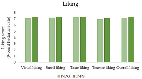 For the two samples tested (P-DG and P-FG), no significant differences were highlighted in terms of liking (appearance, smell, taste, texture, and overall) (Figure 1). In fact, the mean scores were: 7.076 (P-DG) and 7.303 (P-FG) for visual liking, 7.168 (P-DG) and 7.328 (P-FG) for olfactory liking, 7.252 (P-DG) and 7.294 (P-FG) for liking the taste, 6.950 (P-DG) and 7.084 (P-FG) for liking the texture, and 7.059 (P-DG) and 7.303 (P-FG) for overall liking. However, considering the ratings obtained for the overall liking of the two samples, it can be assumed that subjects liked them moderately (a rating of 7 on the 9-point hedonic scales corresponds to “like moderately”).