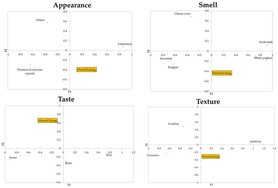 According to the Cochran’s Q test results, three visual attributes, five smell descriptors, two taste attributes, and one texture descriptor of the Parmigiano Reggiano PDO cheese tested were significant to discriminate between the samples (Table 2). Furthermore, the taste attribute “bitter” and the texture attributes “friability” and “graininess” showed p-values very close to significance (α = 0.05) (Table 2). Thus, a total of 14 descriptors (3 related to appearance, 5 to smell, 3 to taste, and 3 to texture) were included in the principal coordinate analysis (PCoA), together with the overall liking scores (Figure 2). As shown in Figure 2, it was highlighted that liking is negatively related to “yellow”, even if the negative correlation is very weak (−0.072). Moreover, the attributes “uniformity” and “presence of tyrosine crystals” were strongly and negatively correlated (−0.538), indicating that when subjects chose “uniformity”, they did not tick “presence of tyrosine crystals”, and vice versa. Liking was also negatively related to “cheese crust” (−0.084) and “sour” (−0.098). Strong correlations were found for the smell attributes “seasoned” and “fresh milk” (−0.652), “pungent” and “fresh milk” (−0.534”), and “white yoghurt” and “fresh milk” (0.564).