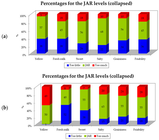 Just-About-Right (JAR) scale percentages of responses grouped in three levels for samples of Parmigiano Reggiano PDO. (a) P-DG—Parmigiano Reggiano produced with milk from cows fed dry hay; (b) P-FG—Parmigiano Reggiano produced with milk from cows fed fresh forage.