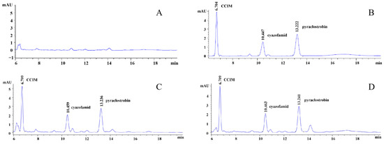 Liquid chromatograms of pyraclostrobin, cyazofamid and CCIM. (A) grape blank sample; (B) pyraclostrobin, cyazofamid and CCIM solvent standard of 0.05 mg/L; (C) pyraclostrobin, cyazofamid and CCIM matrix standard of 0.05 mg/L; (D) addition and recovery of 0.05 mg/kg of pyraclostrobin, cyazofamide and CCIM in grapes.
