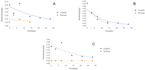 The degradation rate of pesticides can reflect their dissipation rate, which has a significant impact on the study of consumer exposure to these pesticides over a long period of time. Most of the pesticide content decreases over time after its application, and these two fungicides also conform to this characteristic (Figure 2), with their dissipation processes following first-order reaction kinetics: