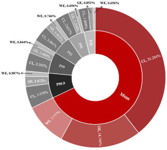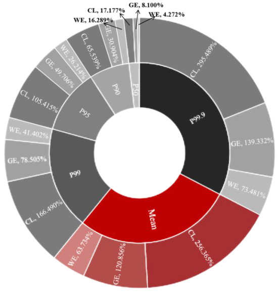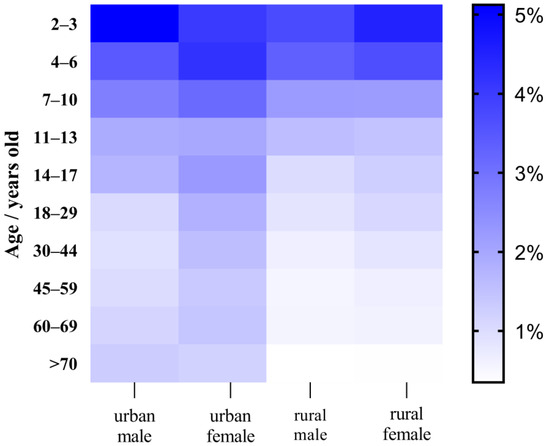 As shown in Figure 5 and Figure 6, urban men had a chronic dietary risk ranging from 0.926 to 5.122% for pyraclostrobin, urban women’s risk ranged from 1.176 to 4.027%, rural men’s risk ranged from 0.348 to 3.729% and rural women’s risk ranged from 0.352 to 4.484%. The chronic dietary risk associated with cyazofamid and its metabolites for urban men varied between 0.784 and 4.334%, for urban women between 0.995 and 3.529%, for rural men between 0.348 and 3.729%, and for rural women between 0.352 and 4.484%. The deterministic model of the chronic risk of pyraclostrobin in grapes is 0.348–5.122%, and the chronic deterministic risk of cyazofamid is 0.249–4.334%. These values are close to the data calculated by the P90 in the probability model of the chronic dietary risk. As shown in Tables S4 and S5, in probability models, the total chronic risk values for pyraclostrobin and cyazofamid were calculated to be 0.112–189.617% and 0.021–1.714%, respectively. There are still cases in which the risk value of pyraclostrobin exceeds 100%, indicating the possibility of endangering consumer health. Women were at a higher risk than men, with rural female children aged 4–6 having the highest exposure risk mainly due to differences in dietary structure and weight distribution among these groups. Except for rural females, the other three types (urban males, rural males, rural females) gradually decrease with age, mainly due to a decrease in grape intake per unit weight as age increases. In addition, both acute and chronic dietary risks indicate that children are more susceptible to pesticide residues posing health risks than adults, as children consume more grapes per unit weight. Therefore, we should pay more attention to the dietary risks of children.
