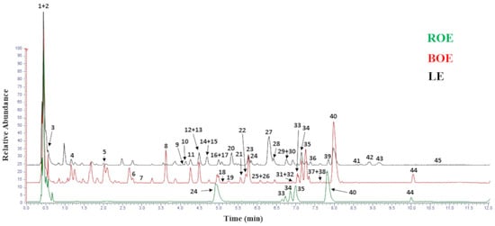 UHPLC–HRMS base peak chromatograms of ROE, BOE, and LE extracts.