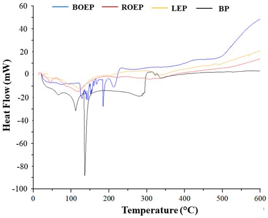 The trends of BP, LEP, and ROEP, although they show different profiles, are characterized by some common signals. The profile of BOEP shows a huge difference in comparison of the other ones. All peaks are endothermic. In the following table, the most significant values for each sample are reported. DSC profiles allow us to obtain important information on the thermal stability, the presence of water, and overall, the crystallization temperatures (Table 3).