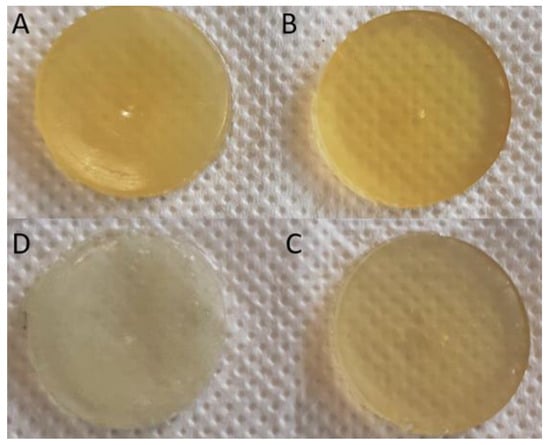 Several gummy formulations were prepared using the heating and congealing method []. Functionalized gelatins ROEP, BOEP, and LEP and commercial gelatin (CG) were used as gelling agents for the production of antioxidant apple-flavored gummies, following a recipe from the literature with some modifications []. Specifically, the recipe used 1.0 mL of commercial apple-flavored water, 0.29 g of sucrose, 50.0 mg of functionalized gelatin, and 117.0 mg of gelatin. For the preparation of the gummies, the gelatin (both functionalized and commercial) was dissolved in the apple water at 30 °C under magnetic stirring to facilitate the hydration of hydrophilic polymer. After complete dissolution, the sugar was added, and the semi-liquid mass was poured into small circular molds made of plastic with a diameter of 3.5 cm and a thickness of 0.5 cm. The samples were stored at 4 °C until analysis (0, 7, and 14 days).