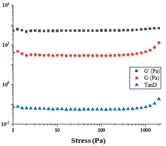 Rheological measurements were obtained by imposing a sinusoidal stress on the samples. The resulting strain component in phase with the stress defines the storage or elastic modulus, G′, while the strain component out of phase with the stress defines the loss or viscous modulus, G″. The applied stress is within the viscoelastic region (100 Pa). All the samples were tested by stress sweep tests at 1 Hz to determine the linear sweep strain range (see, for instance, the figure). G′ and G″ were measured in the frequency range of 0.1–60 Hz (frequency sweep tests or mechanical spectra), as reported in Figure 4.