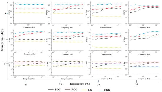 The frequency sweep tests were performed at 20, 25, 30, and 35 °C at three different storage times (0, 7, and 14 days) and the results are reported in Figure 5.