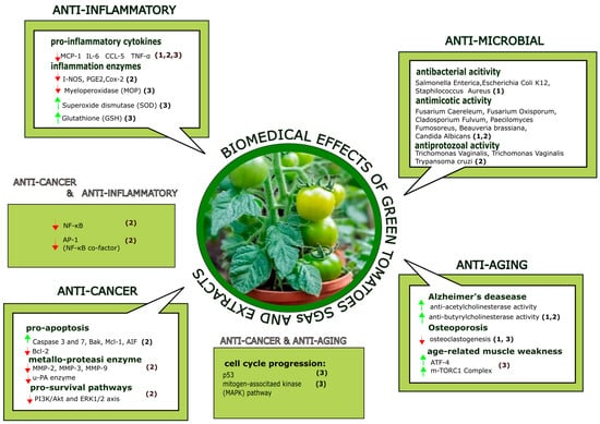 Although last two decades have witnessed increasing scientific evidence supporting the beneficial health effects of green tomatoes and SGAs such as α-tomatine, tomatidine, and tomatidinol [76], green tomatoes have been shown to possess a wide variety of biological activities and exert antiviral, fungicide, antibiotic, anti-inflammatory, anticarcinogenic, and anti-aging effects, as summarized in Table 3 and in Figure 2 [39,52,77,78,79,80].