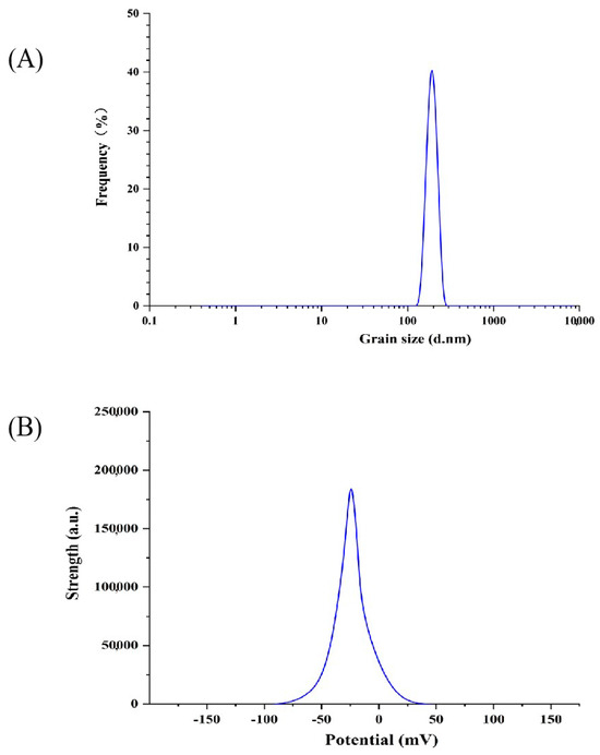 Zeta potential and particle size distribution of P-ACPL (phosphorylated Auricularia cornea var. Li. Polysaccharide liposomes): (A) particle size distribution, (B) potential distribution.