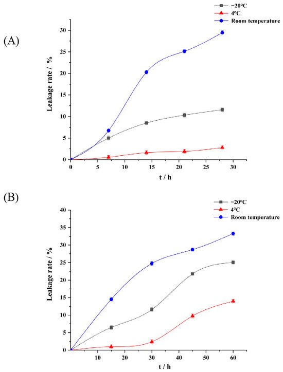 As can be seen in Figure 3A, the appearance of P-ACPL did not change significantly after it was placed at room temperature, 4 °C, and −20 °C for 28 days, and precipitation occurred at room temperature. The packet encapsulation rate of P-ACPL was 85.74%. The encapsulation rates of P-ACPL at −20 °C, 4 °C, and room temperature were 75.80%, 83.36%, and 60.48%, and the leakage rates were 11.59%, 2.78%, and 29.46%, respectively. In summary, P-ACPL is suitable for storage at 4 °C and has the characteristics of small morphological change, low leakage rate, and strong stability. The increase in P-ACP leakage may be due to the increased mobility and oxidation rate of phospholipids at higher or lower temperatures [38].