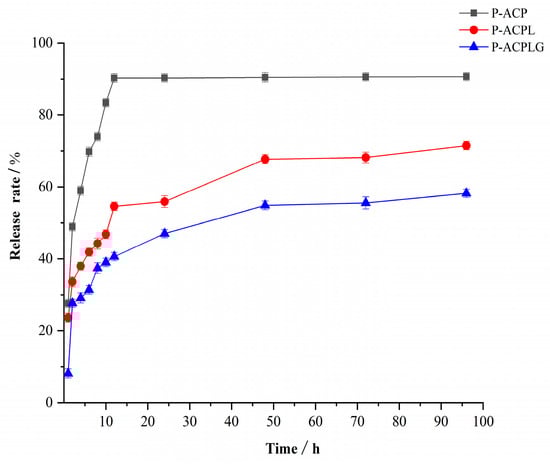As can be seen in Figure 4, the in vitro release of P-ACPL and P-ACPLG was investigated, and the results of the comparison with P-ACP show that the release rate of the P-ACP group reached 83.45% at 10 h and was completely released at 12 h. The P-ACPL and P-ACPLG were released rapidly within the first 2 h, with release rates of 35.70% and 27.66%, respectively. From 2 h to 48 h, the P-ACP and P-ACPL had a slow release process and then tended to be smooth. At 48 h, the P-ACPL and P-ACPLG were released completely, and their release rates were 64.94% and 54.87%, respectively. Compared to the P-ACPL, the sustained release effect of the P-ACPLG is more obvious. This is due to the reduced drug release rate of liposome gels, but the release time is longer, and the dosage form is more stable. Because the gel itself hinders the release of drugs [40], the liposome is dispersed in the gel, which improves the stability of the liposome.