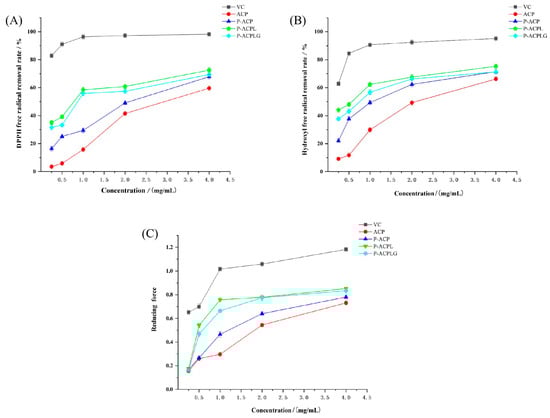 The determination of the reducing power of natural products is one of the indexes to evaluate the antioxidant activity of substances in vitro [46]. The reducing power of P-ACPLG is shown in Figure 5C. In the concentration range of 0.25 mg/mL−4 mg/mL, the higher the absorbance of L-ascorbic acid, ACP, P-ACP, P-ACPL, and P-ACPLG, and the stronger the reducing power is. The reducing capacity increased with the increase in concentration, but the reducing capacity of L-ascorbic acid was significantly higher than that of other samples. At 4.0 mg/mL, the reducing power of L-ascorbic acid, ACP, P-ACP, P-ACPL, and P-ACPLG were 1.182, 0.761, 0.846, 0.852, and 0.803, respectively. The reason may be that carbomer 940 plays a role in wrapping P-ACPL, avoiding the oxidation of polysaccharide, and resulting in a slight reduction in the reducing power of P-ACPL but greatly retaining the reducing power of P-ACPL.